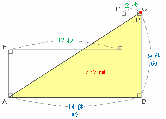 上の図で、点Pが頂点BからCまで進むのにかかる時間は9秒、そして辺ABの長さはFEとDCの長さの合計と等しいので、もし点Pが辺AB上を進んだら12+2=14秒かかります。