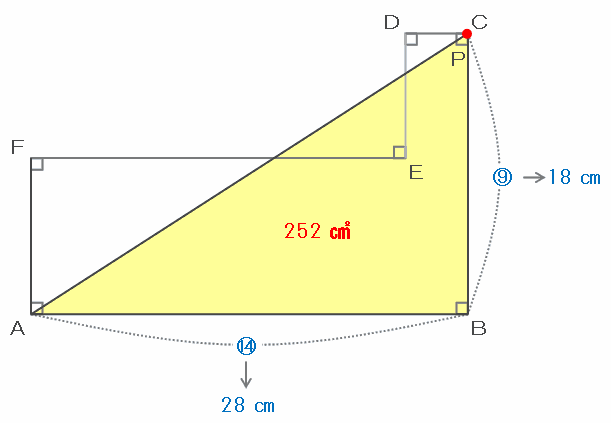 実際の三角形PABの面積である252㎠は、比で求めた面積である63の252÷63=4倍であり、4=2×2なので、次の図のように辺ABの長さを14×2=28㎝、そして辺BCの長さを9×2=18㎝にすれば、三角形PABの面積が28×18÷2=252㎠になってピッタリです。