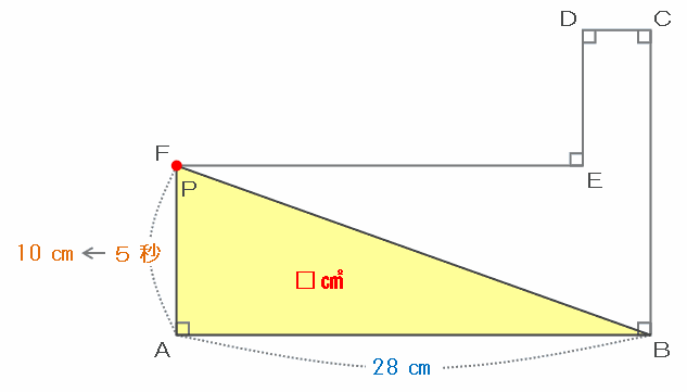 グラフから、点PはFA間を5秒で進むことが読み取れ、しかもさっきの問題で点Pの進む速さは毎秒2㎝であることも分かったので、辺FAの長さは2×5=10㎝です。