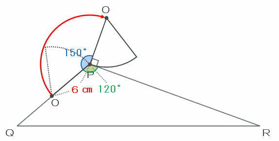 次の図のように、おうぎ形が三角形の頂点Pを中心として時計回りに回転し、辺OPと三角形の辺PRが直角になったとき、おうぎ形の点Oは下の図の赤い矢印のように動きます。