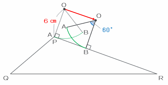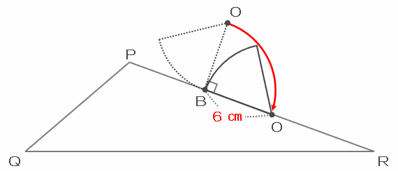 次の図のように、おうぎ形の孤ABが三角形の辺PR上を転がっている間は、点Oは辺PRから6㎝上の地点を、赤い矢印のようにまっすぐ右へ進みます。