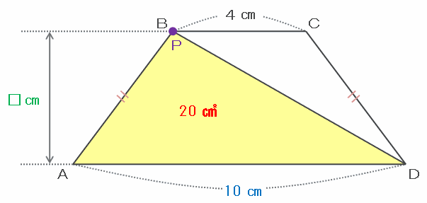 上の図のように、三角形ADPの高さを□㎝とおくと、三角形ADPの面積を求める式は「10×□÷2=20㎠」と表せるので、□には20×2÷10=4㎝があてはまります。