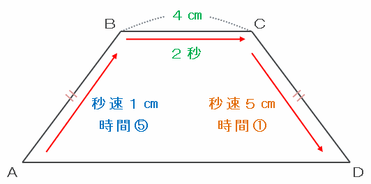点Pは辺ABを秒速1㎝で5秒かけて進むので、辺ABの長さは1×5=5㎝です。また、ABCDは等脚台形なので、辺CDの長さも5㎝です。