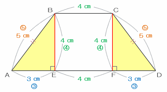 上の図のような「3辺の比が3:4:5となる直角三角形」のことを知っていれば、辺ABとCDの長さが5㎝となることにすぐ気がつくのですが、知らなくてもちゃんと解けるので、まぁ好きにしてください。