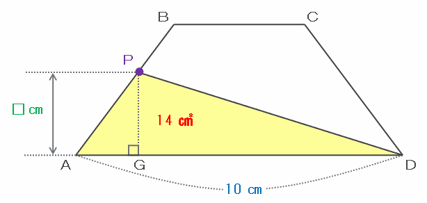 次の図のように、三角形ADPの面積が14㎠となるときの高さである辺PGの長さを□㎝とおくと、面積を求める式は「10×□÷2=14㎠」と表せるので、□には14×2÷10=2.8㎝があてはまります。