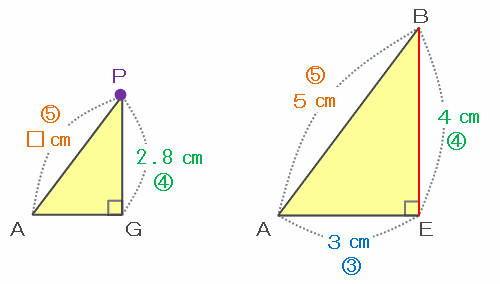 また、さっきの問題で次の図の三角形ABEは辺BEとABの長さの比が4㎝:5㎝=4:5となることが分かったので、ABEと相似の関係であるAPGの辺PGとAPの長さの比も4:5となります。
