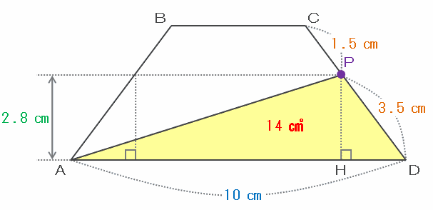 三角形ADPの面積が2回目に14㎠となるのは、次の図のように点Pが辺CD上へと進み、ADPの高さにあたる辺PHが2.8㎝となったときです。