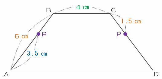 また、点Pは辺AB上を秒速1㎝で進むので、3.5㎝進むのにかかる時間は3.5÷1=3.5秒です。