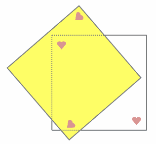 次の図のように、2枚の同じ大きさの正方形の色紙が平らな机の上で重なっています。この重なっている部分に針をさして、上の黄色い色紙だけをその針を中心に回して上の色紙が下の色紙にぴったりと重なるようにしたいと思います。