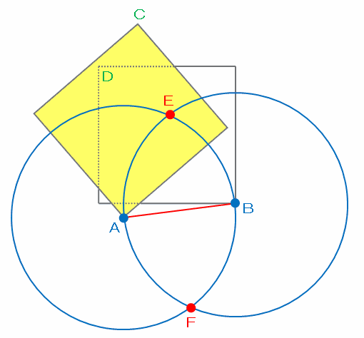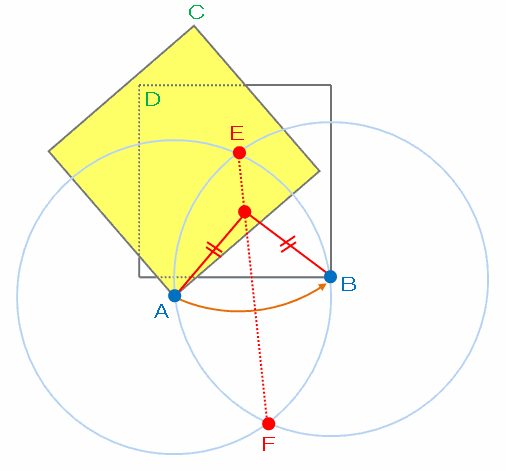 次の図の点AとBを中心にして、辺ABの長さを半径とする円をコンパスでかいてみると、2つの円が2か所で交わるので、その2つの交点をそれぞれE、Fとします。