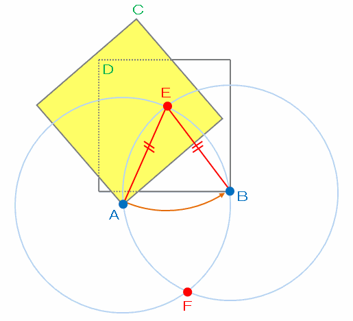 つまり、針を点Eにさして黄色い紙をクルッと回転させれば、点AはBの位置へ移動します。