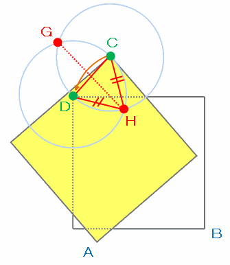 辺GHの線上であれば、どこでも点CとDからの距離が等しいので、たとえば下の図の点Hに針をさして黄色い紙を回転させると、点CはDの位置へ移動します。