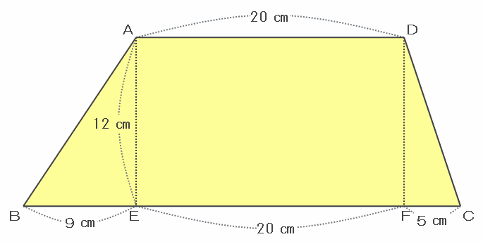 次の図の台形ABCDは、上底ADの長さが辺EFと同じく20㎝、下底BCの長さは9+20+5=34㎝、そして高さAEは12㎝です。