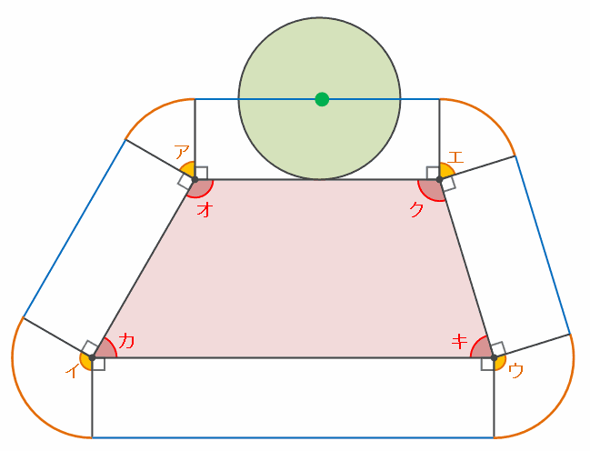 ・左下の頂点→おうぎ形の中心角イ、90度が2個、台形の内角カ