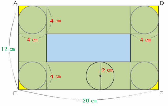 長方形AEFDの内側を半径2㎝の円が1周するとき、次の図の緑色の部分を通過するので、長方形全体の面積から「中央の青い長方形」と「すみっこにある4つの黄色い部分」の面積を引けば緑色の部分の面積が求められます。
