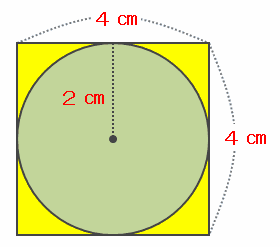 また、次の図を見れば分かるように、黄色い4か所の部分の面積は、1辺4㎝の正方形の面積から半径2㎝の円の面積を引けば求められるので、4×4-2×2×3.14=3.44㎠になります。
