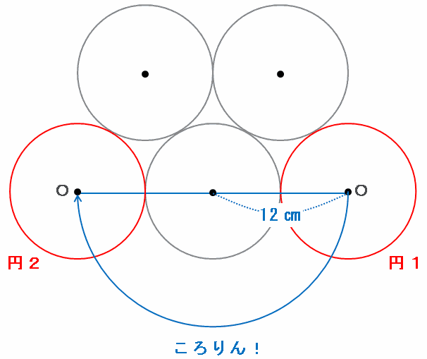 次の図の赤い円1が円2の場所まで動くとき、中心Oが通る道は青い線のような半径12㎝の半円になります。
