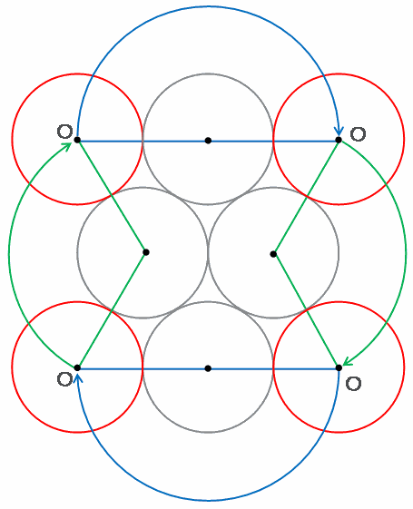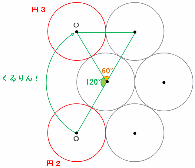 赤い円が外側を1周すると、次の図のように青い半円と中心角120度のおうぎ形が2つずつできます。