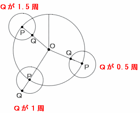 このとき、点Qは小さい円のまわりを0.5周進むごとに直線OPやその延長線上に来るので、そのたびに3点O、P、Qは一直線になります(次の図)。