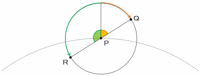 次の図のように、点Qと点Rが小さい円の周上を逆回りに合わせて180度進んだとき、3点P、Q、Rは一直線になります。