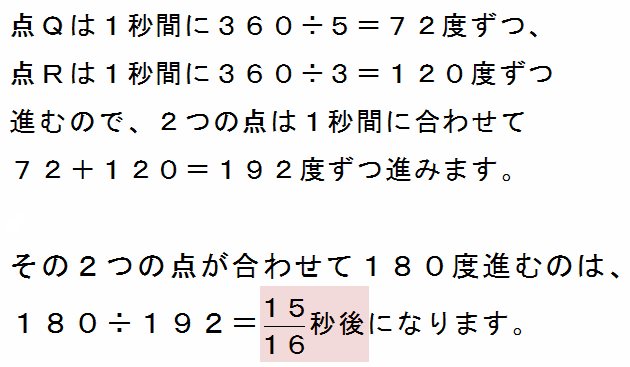 点Qが180度進むのにかかる時間は180÷72=2.5秒間、そして点Rが180度進むのにかかる時間は180÷120=1.5秒間なので、2.5と1.5の最小公倍数である7.5秒ごとに、この2つの点は同時に180度の倍数だけ進むことになります。