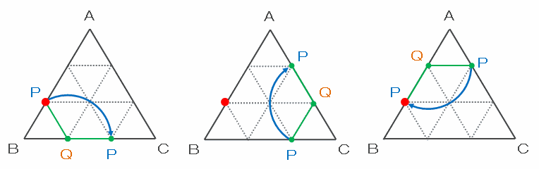 この図のように、点Qを中心として3回目に回転移動したとき、点Pは辺AB上のスタート地点へ戻ります。