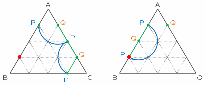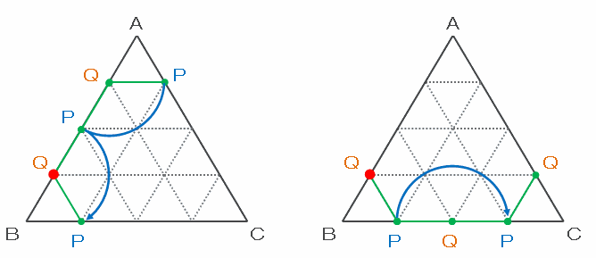 1辺1234㎝の正三角形ABCの辺AB上にある赤い点から、次の図のように棒PQが回転しながら辺BC上を移動するとき、点Pが動いた線は、