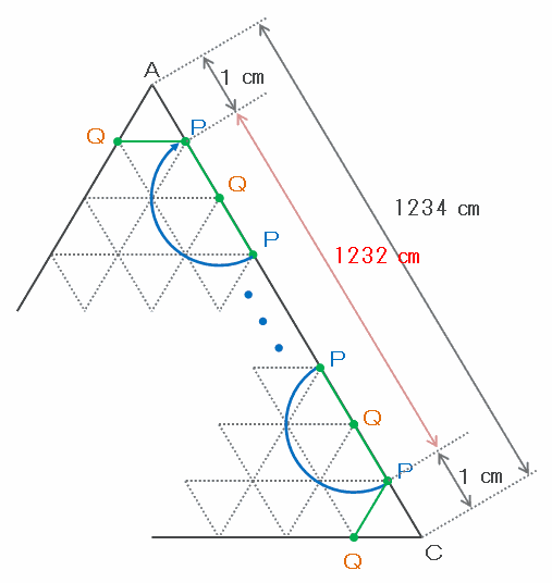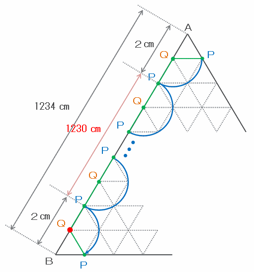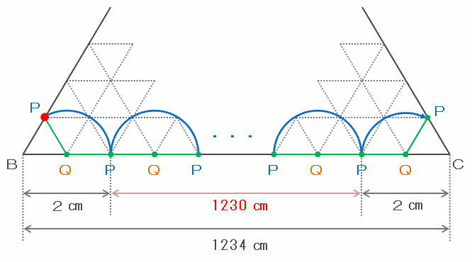 また、次の図のように辺CA上を進むときには、(1234-1×2)÷2=616個の半円ができ、次の辺AB上は点Qから始まります。