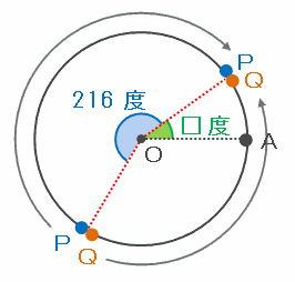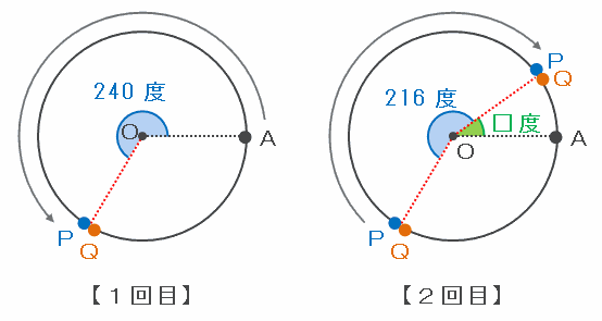 次の図のように、2つの点が1回目にぶつかった地点から向きを変えて進み始め、2回目にぶつかるまでに進んだ角度の合計も360度なので、その間に点Pは360×5分の3=216度進みました。
