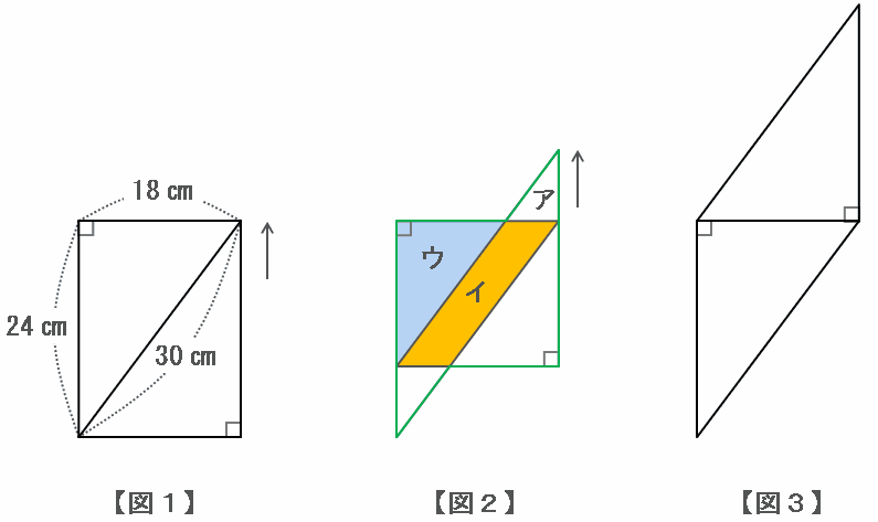 図1のように、同じ形の直角二等辺三角形が2つあります。右下の三角形が、3秒間に2㎝ずつ一定の速さで矢印の方向に移動します。途中で図2のようになり、図3の位置で止まりました。