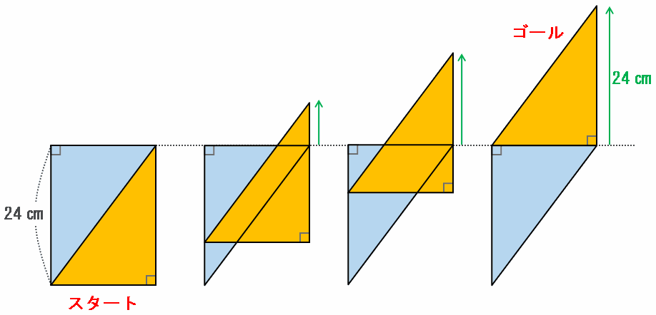 次の図のオレンジ色の三角形がスタート地点からゴールの位置まで進むためには、真上へ向けて24㎝進む必要があります。