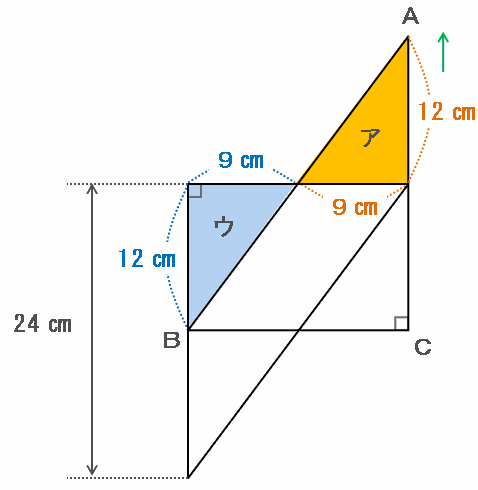 アとウの面積を等しくするためには、次の図のように三角形ABCをスタートの位置から真上へ24÷2=12㎝動かして、アとウを合同にすればOKです。