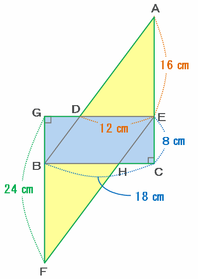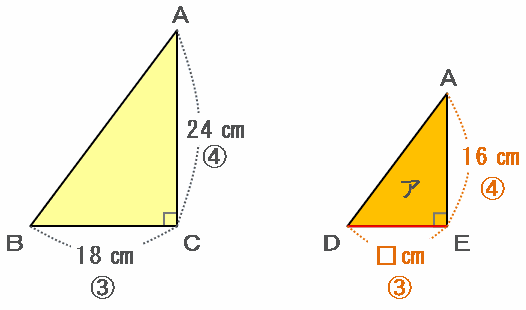 このとき、下の図の三角形ABCと三角形ADEは相似なので、どちらの三角形も底辺と高さの比は18㎝:24㎝=3:4になっています。