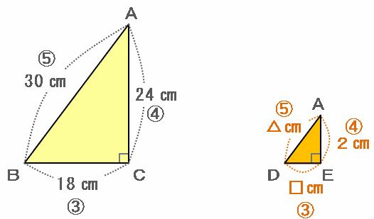次の図の三角形ABCは、辺の長さの比が短い順に18㎝:24㎝:30㎝=3:4:5になっています。