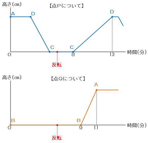 次のグラフは、それぞれ点P、Qについて、「時間」と「底辺BCからの高さ」の関係を表したものです。