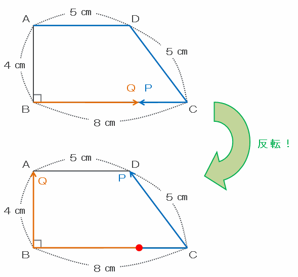 つまり次の図のように、点PとQは辺BC上で出会ってお互いに反転し、点Pは辺CDの5㎝を13-8=5分間で進み、点Qは辺BAの4㎝を11-9=2分間で進んだことが分かります。