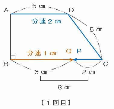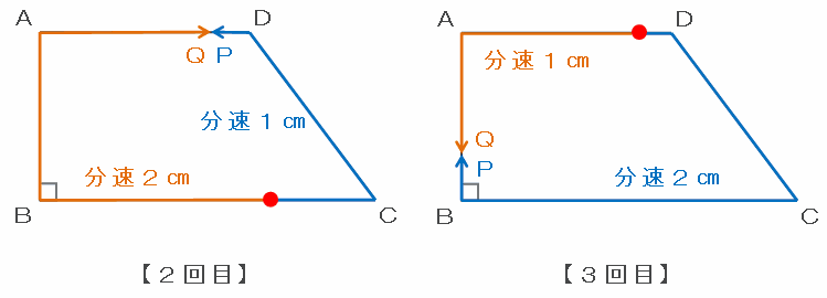 次の図のような台形ABCDがあります。点Pは、Aを出発し時計回りに、点Qは、Bを出発し反時計回りに、それぞれ一定の速さで動きます。2点P、Qは同時に出発し、出会うたびに、進む方向と速さが入れかわります。