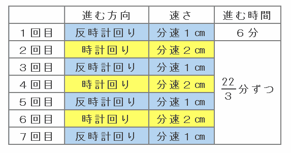 ・1回目に出会うまで→反時計回りに分速1㎝で6分間進む。