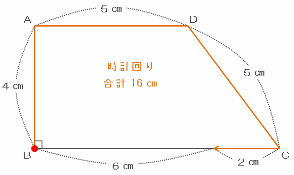 2回目に出会うのは、2つの点が合わせて台形の1周分の距離にあたる4+5+5+8=22㎝進んだときです。
