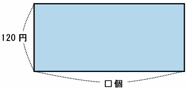 たてじくがパン1個の値段(120円)、横じくが6月に売れたパンの個数(□個)、そして面積(120円×□個)が6月の売り上げを表しています。
