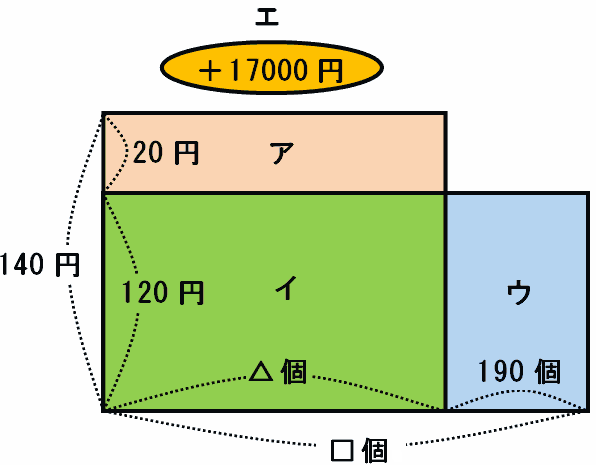 これがア+エと等しいので、20円×△個+17000円=22800円と表せます。