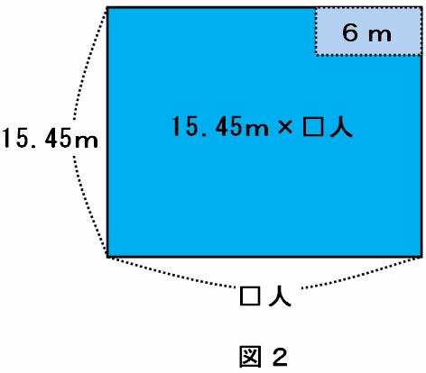 上の面積図全体は「15.45m×□人」で求められますが、それだと本当の合計よりも6m多くなっているはずです。