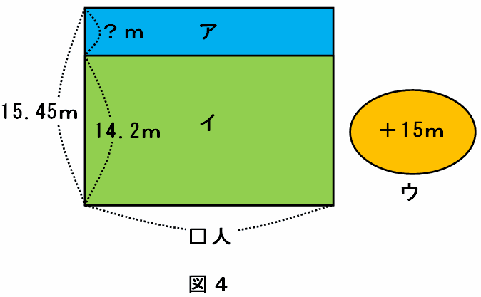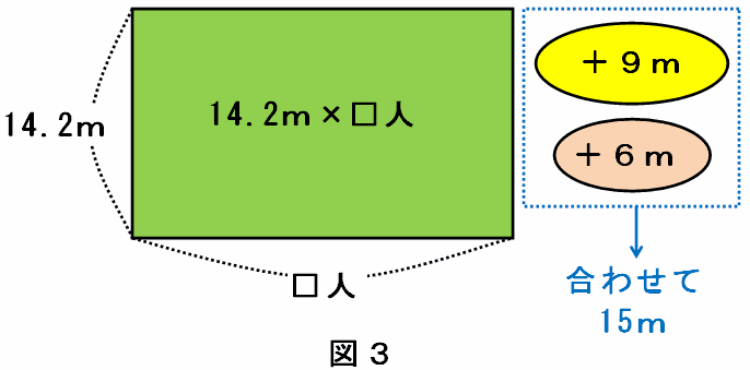 アの?mは15.45-14.2=1.25m、そしてアの部分は1.25m×□人=15mとなることが分かっているので、女子の人数である□人は、15÷1.25=12人になります。