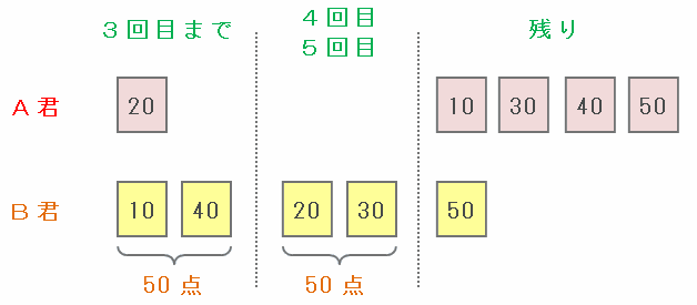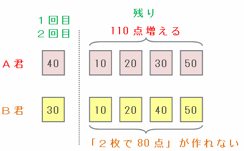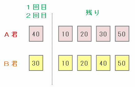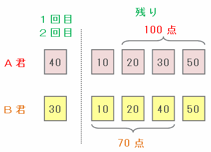 1回目と2回目で、A君は40点、B君は30点のカードを取ったので、その時点で2人がまだ引いていないカードは、次の図のように、