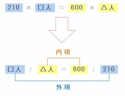 その「210×□人」と「600×△人」の答えは同じなので、次の図のように「比の内項と外項の積は等しい」ことを利用して、□人と△人の比を求めてみると、□人:△人=600:210=20:7となります。