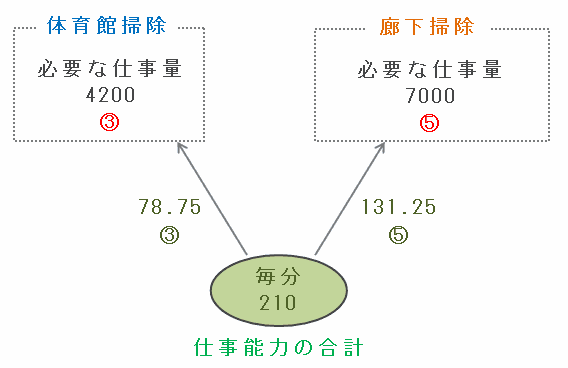 つまり、体育館と廊下を掃除するのに必要な仕事量の比は4200:7000=3:5なので、中学生と高校生の仕事量の合計を3:5に比例配分すれば、2か所の掃除が同時に終わります。