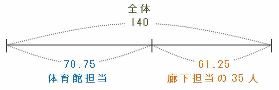 また、上の図で体育館掃除に振り分けた仕事量である78.75は、35人が抜けた後の中学生グループの仕事量を表しています。