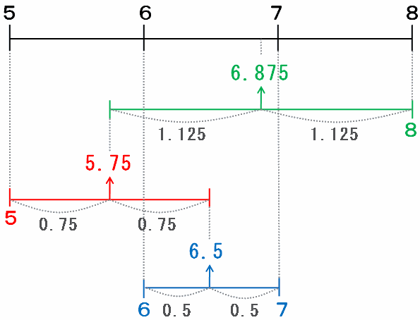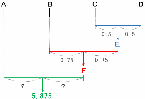 上の図のAからFまでは1+0.75=1.75はなれているので、図の?は1.75÷2=0.875になります。