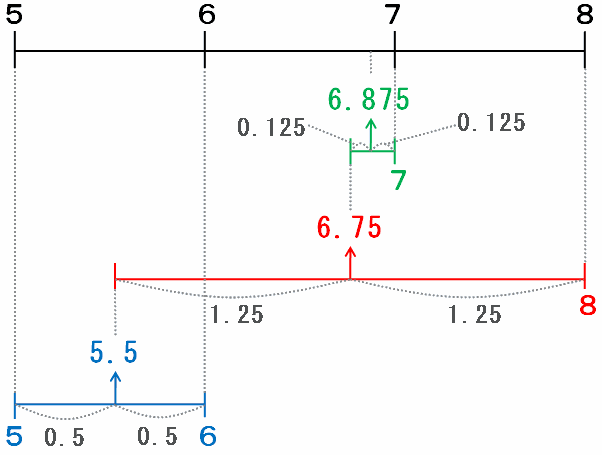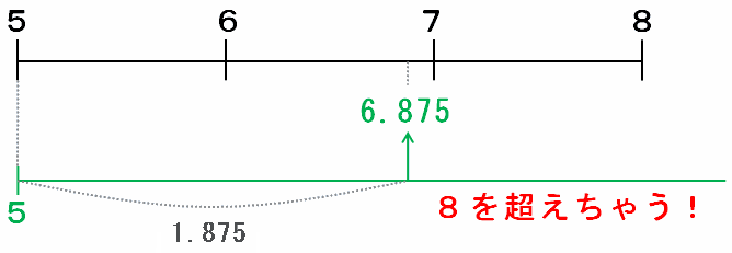 最後の平均である6.875と左はしの5との差は1.875なので、右はしの数(つまり2回目の平均)は6.875+1.875=8.75になってしまいます。