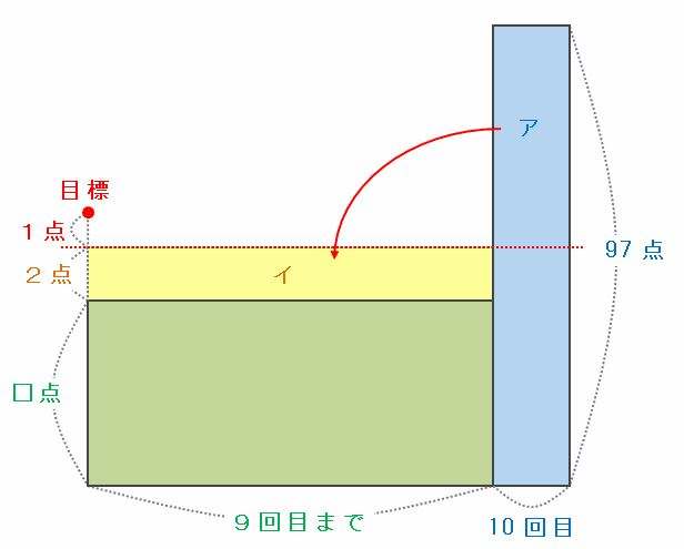 目標点は9回目までの平均である□点よりも3点高い位置にあるので、10回目はかなり高い得点を取って、足りない部分(下の図のピンク色の長方形)を埋める必要があります。